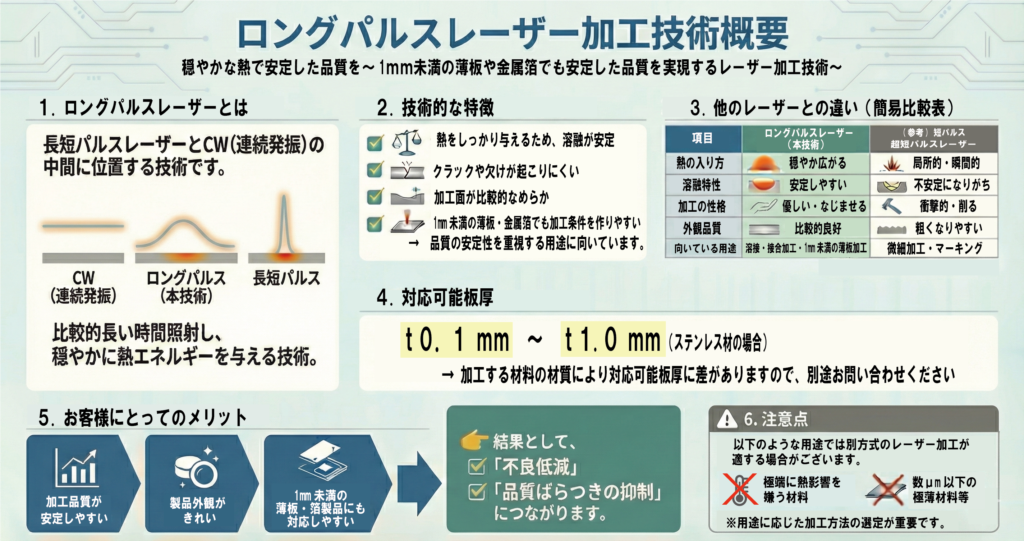 ロングパルスレーザー加工は、比較的長いパルス幅でエネルギーを照射し、金属を溶かして切断する方式です。